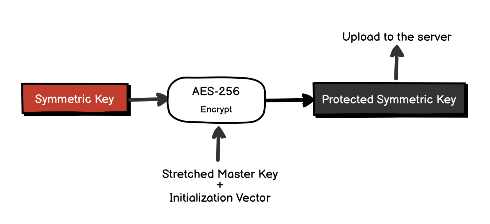 The Symmetric Key also gets encrypted using AES-256, with the Stretched Master Key and the IV to create the Protected Symmetric Key, which will be sent to the server for later use (more on this later).